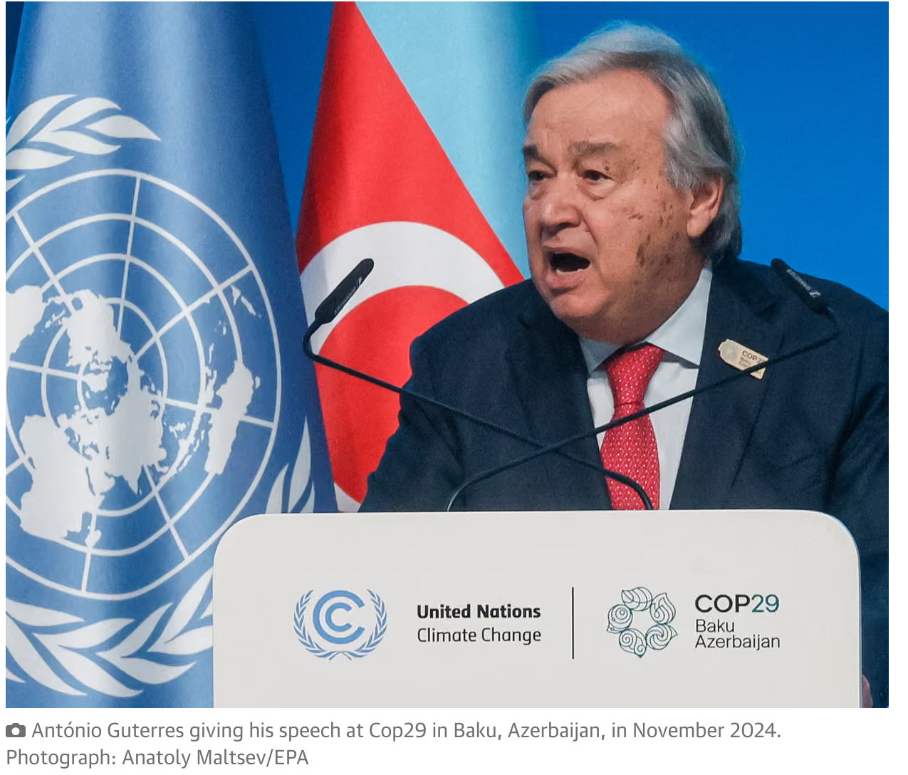 Në këtë situatë, Guterres e përshkroi veprimin klimatik global si “të kapur peng” nga interesat e industrisë së lëndëve djegëse: nafta, qymyri dhe gazi, të cilat vazhdojnë të dominojnë politikat ekonomike. Ai kërkoi pjesëmarrje më të madhe të shoqërisë civile dhe komuniteteve indigjene në proceset vendimmarrëse, duke paralajmëruar se dominimi i lobistëve të industrisë fosile po minon qëllimet e Marrëveshjes së Parisit.